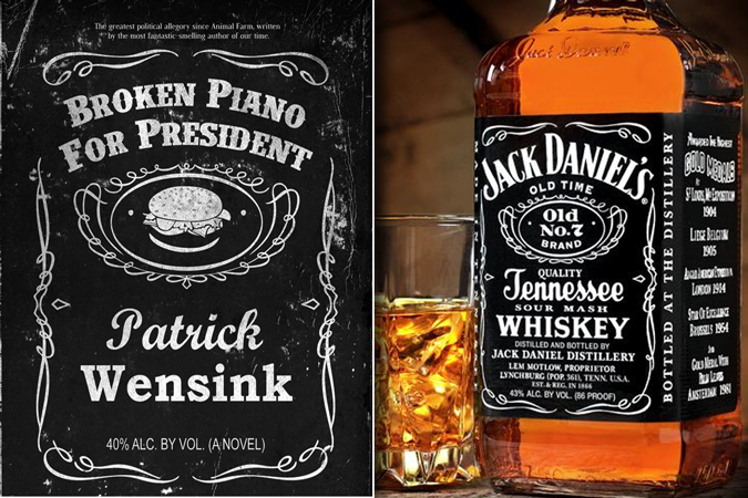L'auteur Patrick Wensink a sorti au mois de mars son dernier roman, Broken Piano For President, disponible à la fois en livre papier et en livre électronique. L'histoire humoristique dépeint un personnage alcoolique, qui provoque une guerre civile après l'invention d'un hamburger particulièrement addictif. Pour l'illustrer, son éditeur Lazy Fascist Press a choisi de réaliser une couverture qui parodie l'étiquette bien connue des bouteilles Jack Daniels. Mais la distillerie ne veut pas laisser faire, et a donc envoyé à l'auteur une lettre qui se dispense cependant de toute menace judiciaire. La marque veut traiter l'affaire entre gentlemen.
