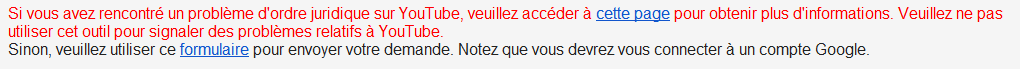 "Veuillez ne pas utiliser cet outil pour signaler des problèmes relatifs à YouTube", demande Google, en rouge dans le texte. Le moteur de recherche demande aux ayants droit de contacter directement YouTube, ce qu'il ne fait pas pour les sites de ses concurrents. YouTube traite les demandes de retrait en direct sur son "centre relatif aux droits d'auteur", ce qui explique que Google ne souhaite pas agir en doublon de sa filiale. Mais YouTube bénéficie ainsi d'un traitement de faveur par rapport aux sites comme Dailymotion qui ont le même type de procédures internes pour écarter le piratage, mais pourront faire l'objet de demandes de retraits d'URL sur Google.