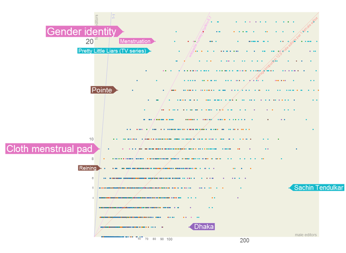 Ainsi par exemple, parmi les sujets populaires auxquels contribuent le moins les femmes figurent le jeu vidéo de guerre Call of Duty, le joueur de cricket Sachin Tendulkar, les différentes compétitions de football, ou des sujets techniques comme le Jailbreaking iOS. A contrario, les femmes sont proportionnellement plus nombreuses à contribuer à l'article sur les pointes dans la danse classique, les menstruations, ou certaines séries TV conçues pour un public féminin comme Pretty Little Liars, The L World, ou the Vampire Diaries. On remarque cependant qu'en valeur absolue, les femmes sont très présentes sur des articles qui intéressent beaucoup les hommes, comme les positions sexuelles, l'orgasme, ou la masturbation.