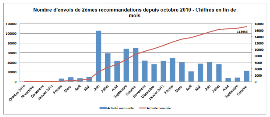 Sur le seul mois d'octobre 2012, l'Hadopi indique qu'elle a envoyé 61 000 avertissements en première phase de la riposte graduée, soit 32 % d'e-mails en plus par rapport à la même période l'an dernier. En revanche, le nombre de seconds avertissements envoyés par lettres recommandées a chuté de manière impressionnante. Alors que 10 385 courriers avaient été envoyés aux présumés récidivistes en octobre 2011, cette année seulement 3379 lettres ont été adressées (- 67,5 %) le même mois. La loi impose que les seconds avertissements soient envoyés en cas de récidive constatée dans les 6 mois suivant l'envoi du premier e-mail.