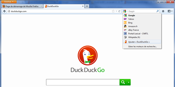 Alors qu'en comparaison, sur Firefox, il suffit de se rendre sur DuckDuckGo.com, de cliquer sur l'icône "Google" dans l'interface du navigateur pour avoir accès à une liste déroulante présentant d'autres moteurs de recherche, et une option "Ajouter DuckDuckGo" :
