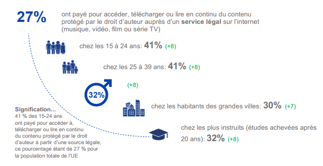 L’EUIPO observe surtout la hausse d’une tendance en matière d’accès légal à du contenu culturel (films, séries…) parmi les jeunes générations du vieux continent comme parmi les 25-39 ans : dans les deux catégories, ils sont 41 % à avoir payé pour ces services, ce qui représente une hausse de 7 % pour les jeunes depuis 2013. Le rapport « vertueux » à ces produits culturels se développe donc, les consommateurs européens reconnaissant « la qualité supérieure » des offres légales sur les illégales.
