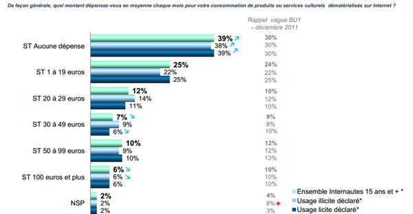 La Hadopi a publié vendredi sa deuxième étude (.pdf) sur les usages des internautes, qui confirme une tendance déjà observée en 2011 lors de la première vague, et que l'on revoit dans chaque étude sérieuse. Les internautes qui déclarent pirater ont sensiblement le même montant de dépenses culturelles que ceux qui ne déclarent que des usages licites. En effet, selon l'étude menée en octobre 2012 par Ipsos, les internautes dépensent en moyenne 21 euros par mois sur Internet pour des offres de produits ou services culturels, et le montant est strictement le même pour les pirates et les gens les plus respectueux de la loi.