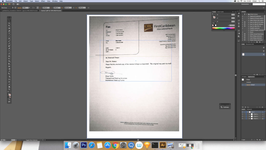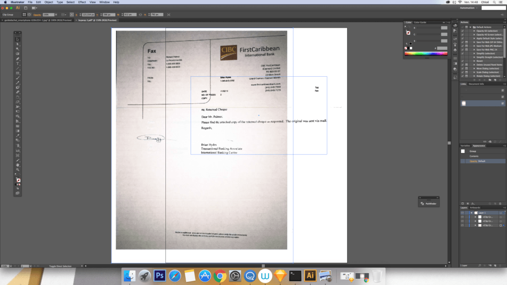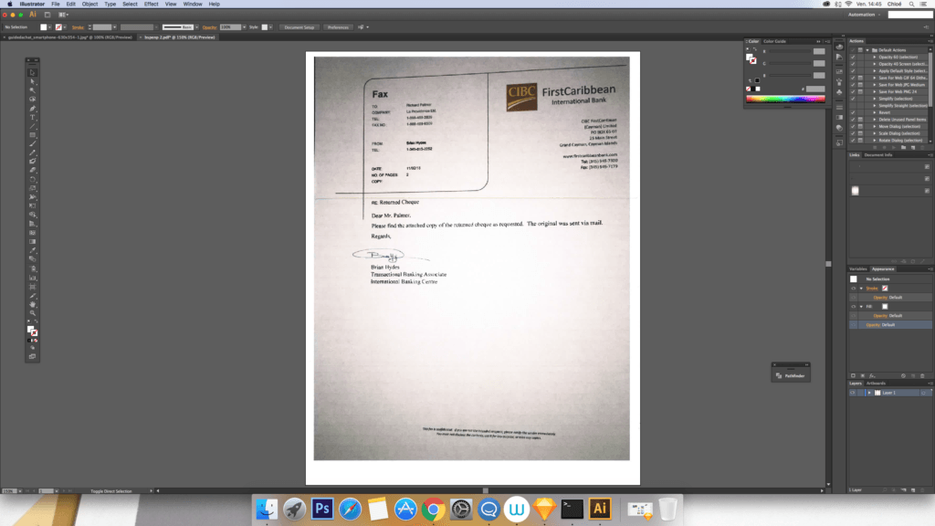 La preuve par calqueMise à jour du 05/05/2017, 14h51 : sur Twitter, un lecteur nous a affirmé que ceux qui ont créé le .pdf qui prouve soi-disant l’existence d’un compte off-shore pour le candidat Macron ont oublié un détail : un calque. Nous avons en effet ouvert le .pdf sur le logiciel Adobe Illustrator et on y voit clairement que le calque du texte a été ajouté à un document vierge qui comporte l’en-tête de la société.
