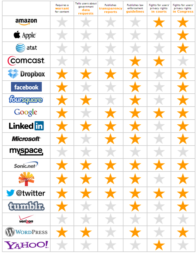 On remarque ainsi que les deux entreprises obtenant la meilleure note (6/6 étoiles) sont Twitter et Sonic, un fournisseur d'accès à Internet basé en Californie. Dropbox, Google, LinkedIn, SpiderOak (un outil de sauvegarde en ligne) sont également très bien notés, avec 5/6 étoiles.