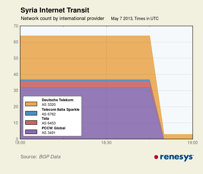 La même tendance est confirmée par Renesys, qui indique que la quasi totalité des chemins reliant la Syrie au reste du monde ont été effacés de la table de routage globale. "Nous n'avons pas pu envoyer avec succès le moindre ping ou traceroute vers n'importe quel serveur en Syrie", explique la société. "Le gouvernement, les sites web, les universités, les serveurs de noms de domaine, les routeurs des infrastructures clé, les banques, les entreprises, les clients DSL, les téléphones mobiles : tout est silencieux."