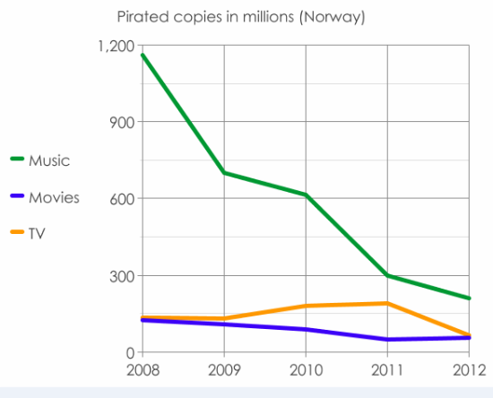 Concernant la musique, le rapport indique que 210 millions de titres ont été piratés l'an dernier contre 1,2 milliard en 2008. Concernant les films, le nombre de contenus piratés est passé de 125 millions en 2008 à 65 millions en 2012. Du côté des séries télévisées, les statistiques ont évolué de 135 millions à 55 millions. Et la faible population du pays (à peine cinq millions) n'explique pas tout.