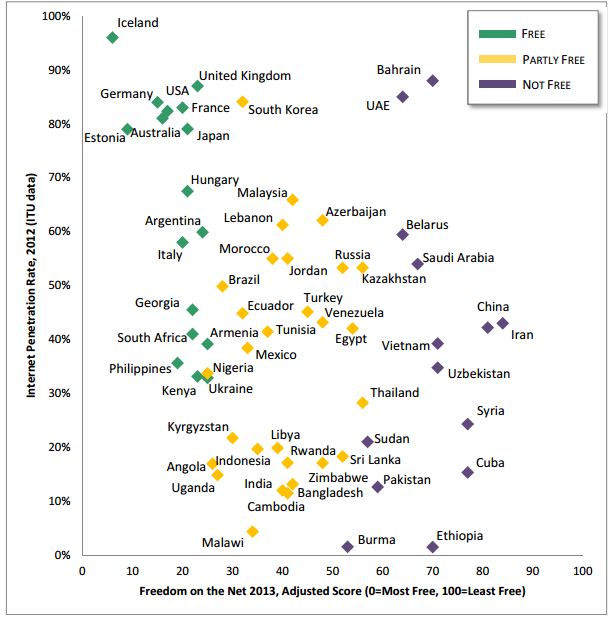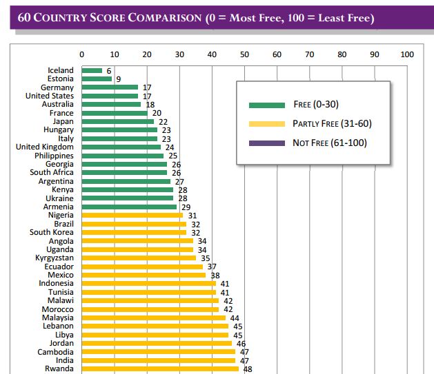 La France obtient la note de 20 (plus celle-ci est basse, plus l'accès au net est libre), se positionnant derrière l'Islande (6), l'Estonie (9), l'Allemagne (17), les USA (17) et l'Australie (18). La France est devant le Japon (22), la Hongrie (23), l'Italie (23) et le Royaume-Uni (24). Et, bien sûr, devant tous les autres pays complétant le classement. L'Iran ferme la marche, avec la note de 91.