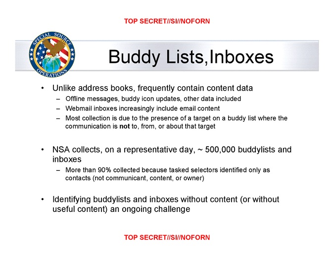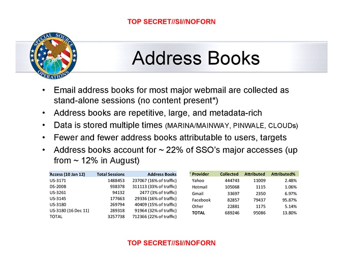 Selon les diapositives "top secrètes" de la NSA, 689 246 carnets d'adresses ont été récupérés au cours du 10 janvier 2012. 444 743 proviennent de Yahoo, 105 068 de Hotmail, 33 697 de Gmail, 82 857 de Facebook et le reste (22 881) de divers autres services. En supposant qu'il s'agit-là d'une collecte standard, on peut supposer que la NSA récupère plus de 251 millions de carnets d'adresses sur une année.