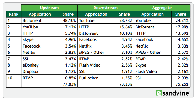 En Europe, selon le dernier rapport Sandvine (.pdf), le partage de fichiers en P2P représente désormais 20,16 % du trafic total (upload et download agrégés) aux heures de pointe, contre 21,5 % il y a un an.