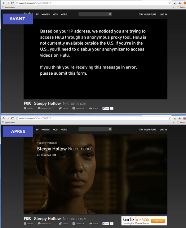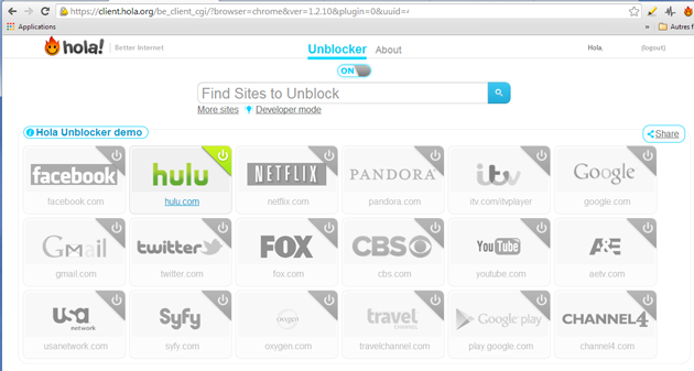 Pour utiliser Hola, rien de plus simple. Il suffit de se rendre sur le site officiel, et de créer un compte en saisissant simplement une adresse e-mail (aucune vérification n’est faite). Une fois l’installation opérée, une fenêtre du navigateur s’ouvre, qui permet de choisir ou d’ajouter des sites à débloquer ; par exemple l’excellent Hulu qui est en principe inaccessible depuis la France, et qui propose de nombreuses séries TV en streaming :