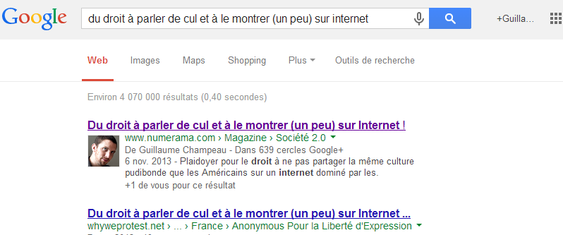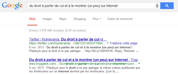 Si vous connaissez le titre de notre article par coeur, et cherchez très explicitement "Du droit à parler de cul et à le montrer (un peu) sur Internet", vous ne trouverez pas directement l'article de Numerama, mais uniquement des reprises sur d'autres sites :