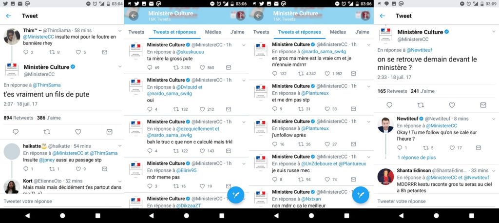 Si vous êtes du genre à vous coucher très tard ou faire des nuits blanches, peut-être avez-vous remarqué une étrange activité sur Twitter dans la nuit de lundi à mardi : en effet, le compte du ministère de la culture, dont le discours est d’ordinaire très policé, a publié pendant plusieurs heures des messages grossiers, parfois insultants, sur le réseau social.