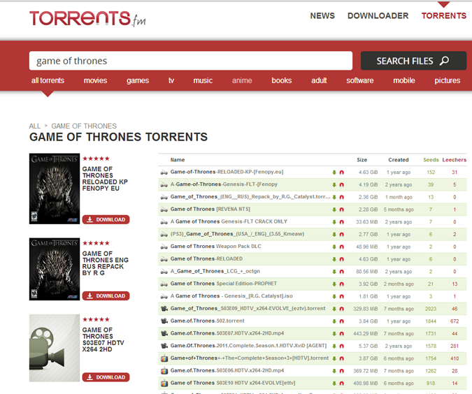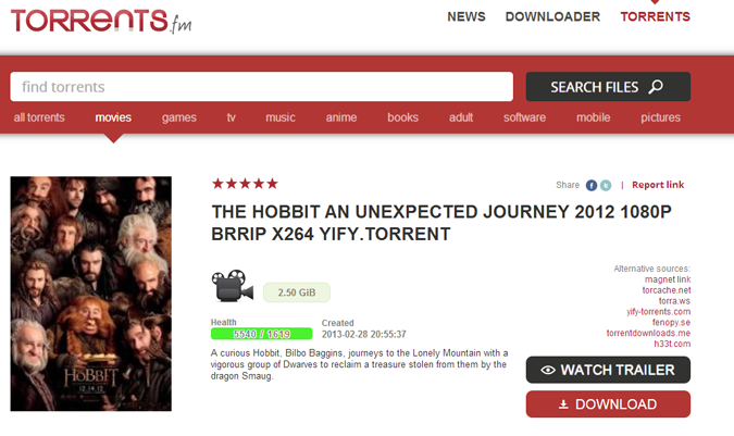 Torrents.fm : un moteur de recherche de liens BitTorrent particulièrement efficace, rapide et bien présenté, qui propose une mise en forme des .torrents avec illustrations et vidéos, détail du contenu du .torrent, liste de sites BitTorrent alternatifs où trouver le même contenu, etc. Tous les torrents sont triés par catégorie, et un indicateur permet de voir en un coup d'oeil la "santé du torrent, c'est-à-dire s'il y a encore suffisamment de seeds pour le télécharger entièrement.