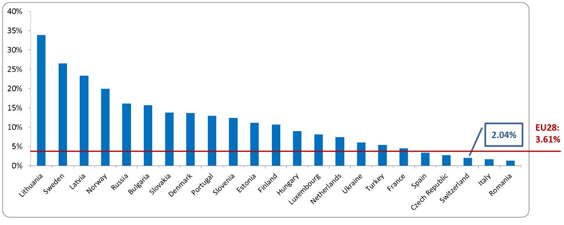 Ainsi, la situation de la Lituanie, de la Suède, de la Lettonie et de la Norvège, qui occupent les premières marges du podium, n'a ainsi strictement rien à voir avec celle de la République Tchèque, l'Espagne, l'Italie ou la Roumanie. Quant à la France, elle est tout juste au-dessus de la moyenne. D'autres pays comme l'Allemagne ou le Royaume-Uni n'apparaissent même pas dans le classement.