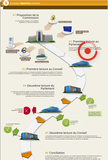 Le texte suit en effet la procédure législative ordinaire de l'Union Européenne, qui correspond à l'ancien processus de codécision (voir l'infographie ci-contre). A ce stade, le texte élaboré et déposé par la Commission européenne a été examiné en première lecture par le Parlement, et amendé. C'était tout l'objet du vote de jeudi. Mais la procédure ne s'arrête pas là, loin s'en faut.