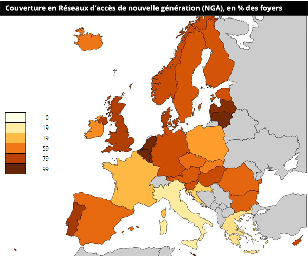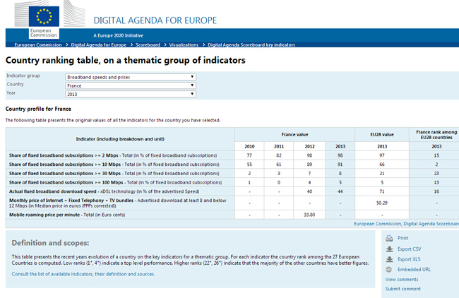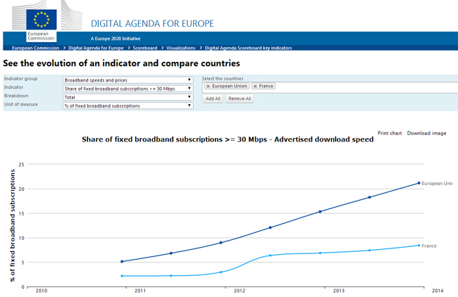 Ou encore voir le classement des différents pays, et constater que la France est 23ème sur 28 en matière d'accès à 30 Mbps :