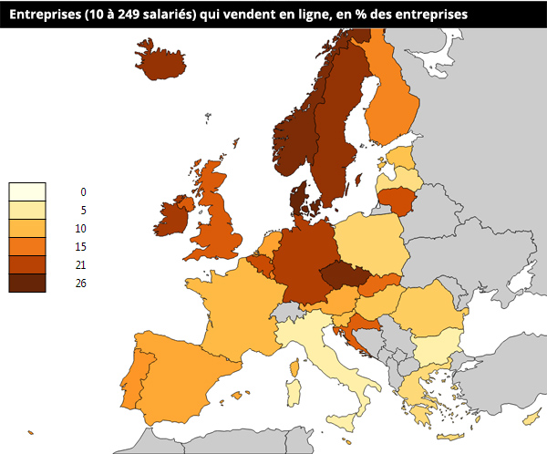 En matière de e-commerce, la France accuse du retard chez les entreprises qui sont encore trop peu nombreuses à utiliser Internet pour vendre. Si 59 % des Français commandent des biens ou des services en ligne, ce qui est largement mieux que la moyenne européenne (47 %), les PME qui vendent sur Internet ne sont encore que 11 %, contre 14 % en moyenne :