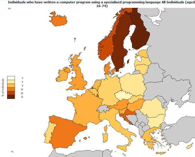 En France, selon des statistiques Eurostat de 2012 10,2 % des individus déclarent avoir déjà développé un logiciel en utilisant un langage de programmation quelconque (ce qui peut n'être que quelques lignes de BASIC à l'école ou de HTML chez soi). Le record européen est détenu par la Finlande, avec 23,4 % des habitants qui ont déjà écrit un logiciel :
