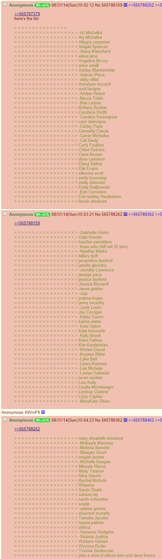 La page où étaient diffusées les photos semble avoir été supprimée de 4Chan au moment où nous écrivons ces lignes, mais Buzzfeed a conservé une capture d'écran du listing impressionnant de célébrités dont les comptes auraient été piratés. Le hacker assure avoir des vidéos de Lawrence en pleine action sexuelle, et quelques 60 selfies dénudés de la star récompensée aux Oscars pour son rôle dans Happiness Therapy.