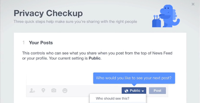 Dans les prochains jours, l’outil sera affiché à l’écran des utilisateurs lorsqu’ils se connecteront à leur compte Facebook, et proposera un réglage des paramètres en trois étapes. D’abord, sélectionner qui voit par défaut les nouvelles publications (tout le monde, que les amis, …), puis quelles applications sont liées au compte Facebook et ont accès à quelles informations, et enfin vérifier les informations du profil et choisir lesquelles sont visibles publiquement. Enfin simple, et efficace.