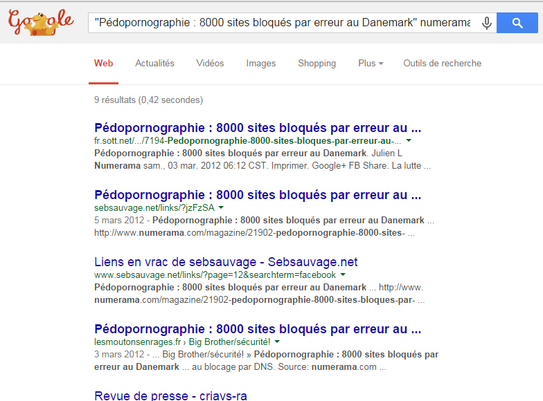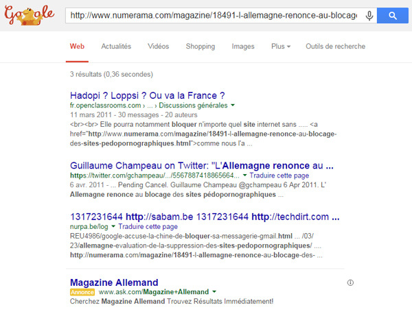 Si vous recherchez l'un des ces articles dans Google, les seuls résultats qui ressortiront seront les sites qui ont eu l'amabilité de reprendre l'information pour la relayer (lesquels, curieusement, ne subissent pas le même blocage, qui paraît donc bien ciblé sur Numerama). Par exemples :
