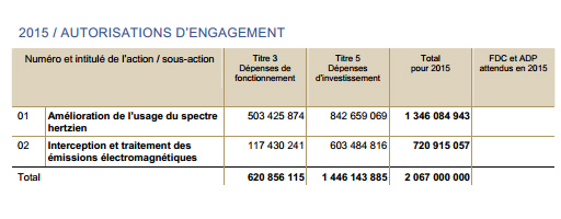 En effet, selon l'annexe budgétaire (.pdf) relative aux programmes de "gestion et valorisation des ressources tirées de l'utilisation du spectre hertzien, des systèmes et des infrastructures de télécommunication de l'Etat", le ministère de Jean-Yves Le Drian demande 2 milliards d'euros pour le programme n°762. Il s'agit du programme intitulé "Optimisation de l'usage du spectre hertzien et interception et traitement des émissions électromagnétiques". L'an dernier, en raisons de ressources exceptionnelles liées à la vente de licences de fréquences hertziennes, la loi de finances n'avait prévu que 11 millions d'euros de crédits pour ce programme en 2014, après une ligne de 698 millions d'euros ouverte pour 2013.