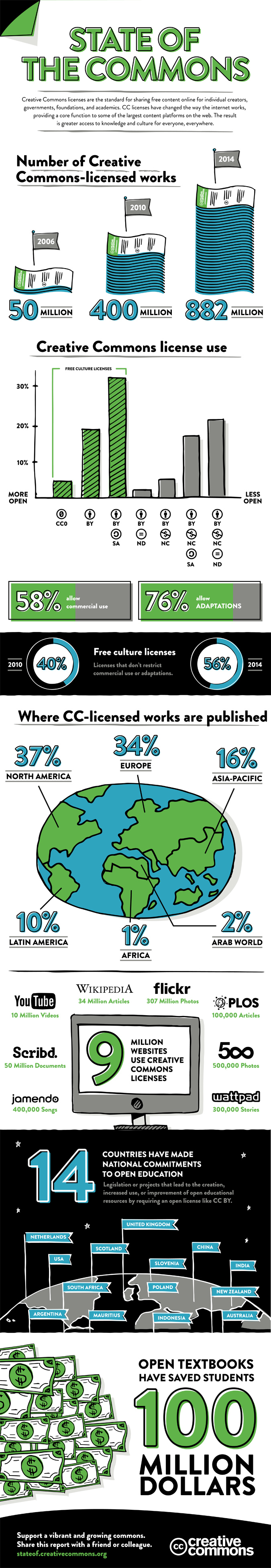 Il ressort ainsi du rapport que 9 millions de sites internet font figurer un lien vers une licence Creative Commons, et que cela couvre au moins 882 millions d'oeuvres de toutes natures. C'est plus du double de ce qui avait été comptabilisé il y a quatre ans.