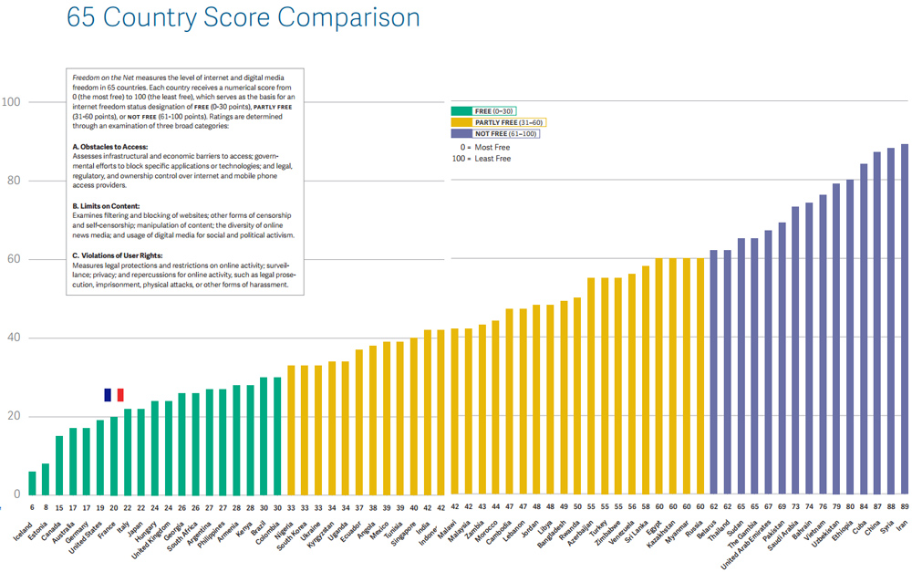 L'association Freedom House a publié son nouveau rapport 2014 (.pdf) sur l'état de la liberté sur Internet dans le monde, avec l'examen comparatif de 65 pays à travers le globe. Comme l'an dernier où la France apparaissait comme l'un des meilleurs pays au monde en terme de libertés sur Internet, l'ONG américaine décerne à la France une note de 80 % (ou plus exactement de 20 sur 100, la jauge étant remplie par la constatation des atteintes aux libertés).