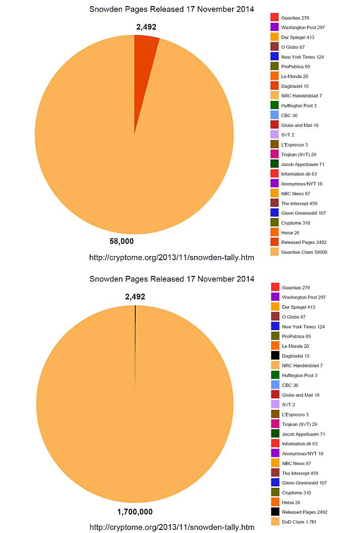 En date du 8 décembre 2014, soit un an et six mois après les toutes premières révélations sur les agissements de la NSA, 2627 pages ont été exposées dans les médias (essentiellement le Guardian, le Washington Post, le New York Times, le Spiegel et The Incercept), selon le suivi de Cryptome. Or, il en resterait encore un nombre incalculable en attente de publication.