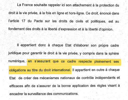 Et pour peu que la France serait tentée de dire qu'elle a au moins le droit (ce qui est prévu) d'appliquer des mesures "de surveillance internationale" plus intrusives qu'en interne, le Haut-Commissariat rappelle que les droits de l'homme sont universels et que les Etats sont tenus de les garantir pour tous les individus où qu'ils soient. Sinon, "non seulement on affaiblirait l’universalité et l’essence des droits protégés par le droit international des droits de l’homme mais l’on pourrait aussi inciter structurellement les États à se déléguer mutuellement les tâches de surveillance". Ce qui est le cas en pratique.
