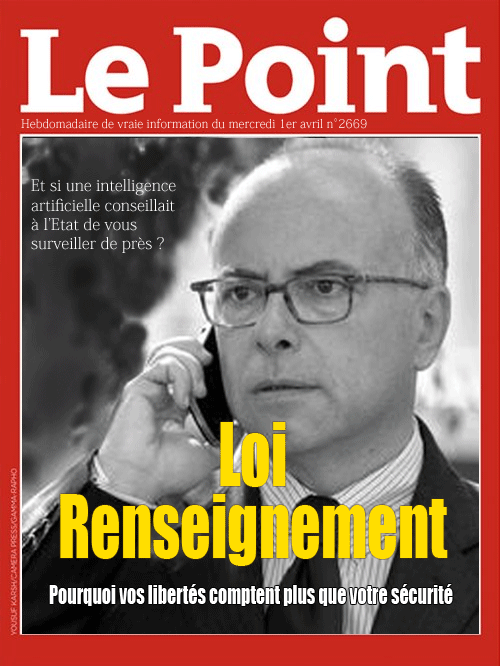 Vous trouviez que le projet de loi renseignement était négligé dans la presse d'information généraliste, au profit de sujets beaucoup plus futiles et court-termistes tels que la tactique électoraliste des différents partis politiques ? Et bien au moins un hebdomadaire a décidé de reprendre en main l'information, et de s'engager. Une bonne raison d'aller l'acheter ! Courez-y.