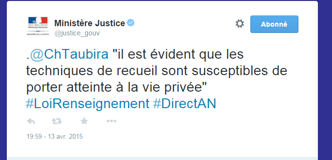 HAHA, bien joué @justice_gouv qui ne cite qu'un seul extrait de @ChTaubira, mais quel extrait ! #PJLRenseignement https://t.co/88s9KIMcHP