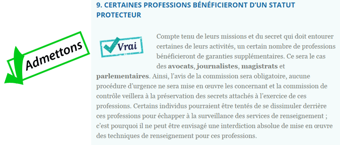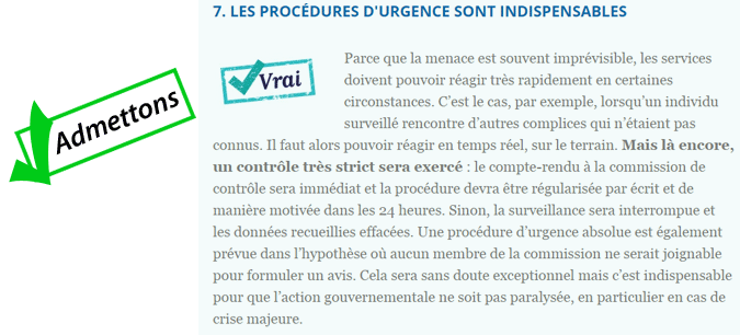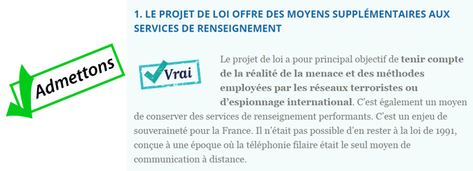 Si l'explication fournie est difficilement contestable puisque sans réel argument précis, on peut toutefois préciser que les "moyens supplémentaires" offerts aux services de renseignement sont surtout théoriques. En pratique, comme l'ont expliqué les ministres en commission des lois, il s'agit pour une large part de légaliser des pratiques qui étaient jusque là illégales. C'est une loi blanchisserie.