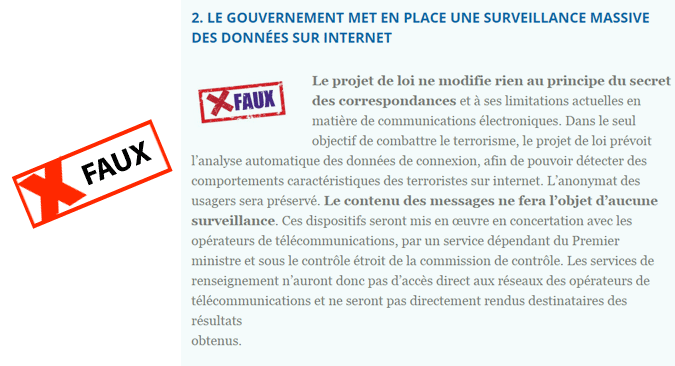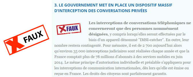 Au moment où s'ouvrait à l'Assemblée Nationale la discussion du projet de loi sur le Renseignement, le Gouvernement publiait sur son site internet un "Vrai/Faux" sur ce que Manuel Valls venait de qualifier tour à tour de "mensonges", "fantasmes" ou interprétations de "mauvaise foi", pour demander aux députés de ne pas écouter les opposants et de voter massivement la loi. En tout, onze points que nous reprenons ici les uns après les autres :