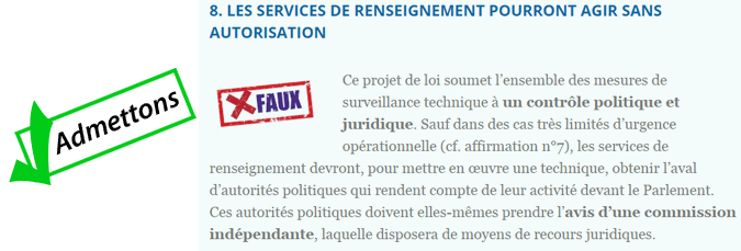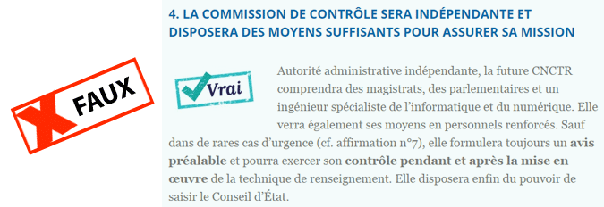 Là encore, c'est une question de mots. Oui, il y aura "autorisation", mais donnée par le Premier ministre, donc par l'Etat à l'Etat. La CNCTR n'aura qu'un avis consultatif et sera limitée dans ses voies de recours par les termes très permissifs de la loi.