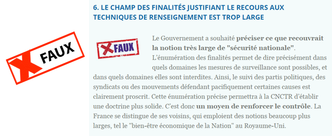 Parmi les 7 motifs autorisant des mesures de surveillance administrative, figurent notamment "les intérêts économiques, industriels et scientifiques majeurs de la France", ce qui n'est pas d'une précision fantastique (quand commence un intérêt "majeur" par rapport à un intérêt "mineur" ?), ou encore "la prévention de la délinquance organisée", ce qui va de la petite équipe de vendeurs de shit aux voleurs de bicyclettes en passant par la fraude sociale, la fraude fiscale, etc. De plus, il n'est pas exact de prétendre que "le suivi des mouvements défendant pacifiquement certaines causes est clairement proscrit", puisque le but affiché et de "prévenir des violences collectives", ce qui est le cas dans à peu près toutes les manifestations, même si leurs organisateurs ont une vision pacifiste. Le but de la prévention est justement de vérifier avant et pendant s'il n'y a pas un risque qu'une manifestation dégénère en violences.