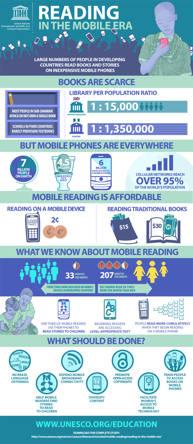 Ce jeudi 23 avril est la Journée mondiale du livre et du droit d'auteur, célébrée à Paris à l'UNESCO. L'organisation rattachée aux Nations Unies met en avant à cette occasion une étude réalisée l'an dernier sur les bénéfices fondamentaux de l'utilisation des téléphones mobiles pour offrir l'accès à la culture dans des pays en développement où les bibliothèques de livres papier sont à la fois rares et trop éloignées des lieux de vie. Les réseaux sans fil et les écrans mobiles sont là bas un excellent moyen d'abolir les distances et d'avoir accès à des bibliothèques entières de livres.
