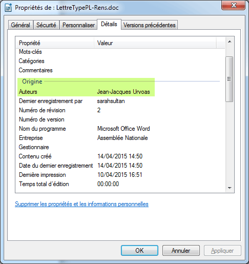 Si l'on en croit les métadonnées présentes dans le document, celui-ci aurait été écrit par Jean-Jacques Urvoas depuis un ordinateur de l'Assemblée nationale début avril 2015, au moment de l'entrée en discussion du projet de loi :