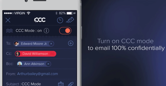 Gratuit mais fondé sur un protocole entièrement propriétaire, Confidential CC se présente sous la forme d'une application mobile qui remplace le client de messagerie habituel sur iOS ou Android, pour ajouter un champ CCC. Lorsque l'adresse e-mail d'un destinataire utilisateur de Confidential CC est entrée dans ce champ, le courriel ne lui est pas envoyé par le protocole SMTP traditionnel, mais par le protocole privé de CCC, qui assure au moins en théorie la confidentialité de l'échange.