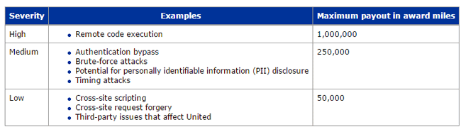 Les hackers qui rapportent des bugs à la société peuvent gagner entre 50 000 miles et 1 million de miles selon la gravité de la faille découverte, la plus grave étant la possibilité d'exécuter du code à distance. Sur son programme d'achat de miles, 1 000 miles sont vendus 35 dollars hors taxe, ce qui représente donc des récompenses d'une valeur de 1 750 dollars à 35 000 dollars.