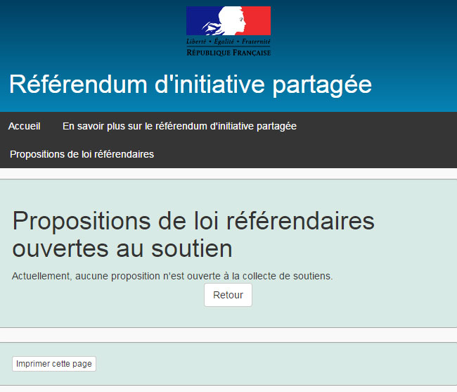 Six mois après son lancement que tout le monde a déjà oublié, le site internet du référendum d'initiative partagée (RIP), qui a coûté plus de 365 000 d'euros à concevoir (!), reste une coquille vide. Il y a toujours zéro proposition de loi référendaire déposée, ce qui n'est guère surprenant, puisque tout l'objet du RIP était d'enterrer le risque (menace ultime en démocratie) que le peuple ne soit amené à s'exprimer sur des questions qu'il juge importantes :