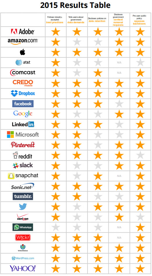 Sur 24 entreprises étudiées, seules 9 ont reçues la note parfaite : Adobe, Apple, Credo Mobile, Dropbox, Sonic.net, Wikimedia, Wordpress et Yahoo. Le pire élève est WhatsApp, l'application de messagerie rachetée par Facebook, qui n'obtient qu'une seule étoile.