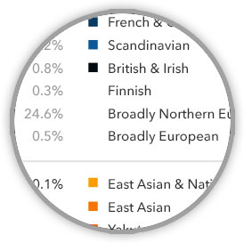Pour des questions réglementaires 23AndMe ne propose plus pour le moment de déterminer les maladies que ses clients sont susceptibles de développer, mais l'entreprise fournit toujours des statistiques sur les origines probables de la personne. On peut ainsi voir quel pourcentage de son ADN provient des populations sub-sahariennes, européennes, asiatiques, scandinaves, françaises, russes, corses… plus 23AndMe a d'éléments de comparaison, plus il peut être précis dans la détermination du profil. La société dit être capable de remonter 750 lignées maternelles et plus de 500 lignées paternelles.
