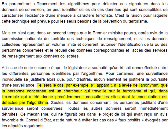Le gouvernement a expliqué très explicitement que lorsqu’une personne sera détectée par les algorithmes en raison de son activité en ligne, les services regarderont pourquoi la personne « consulte les sites dont la consultation est détectée par l’algorithme« . Il y a donc bien prévu l’utilisation des « informations consultées » par l’internaute, qui sont pourtant exclues par la loi, comme l’a rappelé le Conseil constitutionnel.