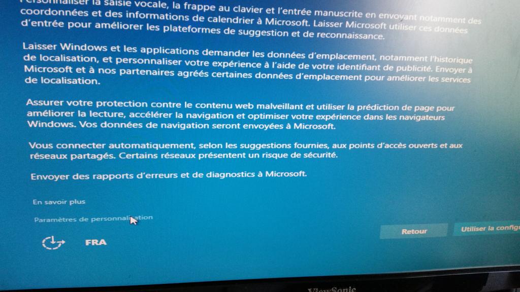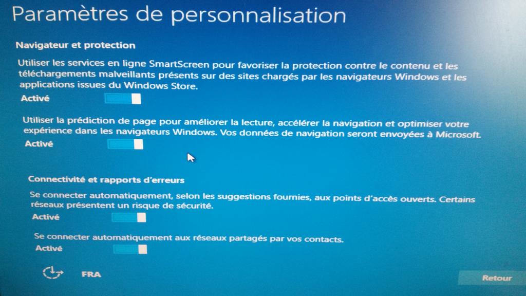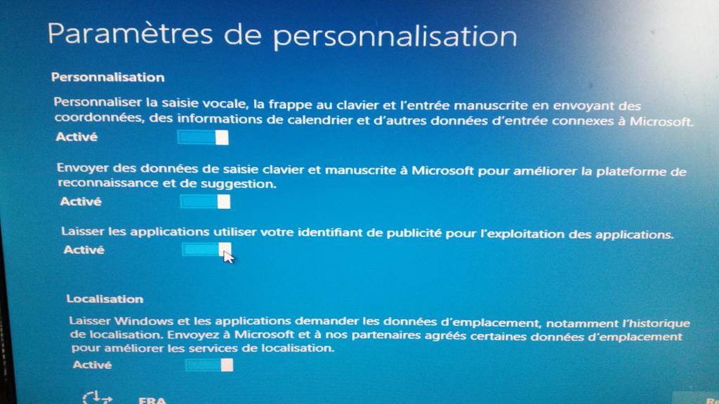 Sur l'un des écrans figure un lien discret, intitulé "paramètres de personnalisation", qui permet d'afficher les options relatives aux informations qui sont susceptibles d'être transmises à Microsoft. Celles-ci sont activées par défaut, incluant celle qui "laisse les applications utiliser votre identifiant de publicité pour l'exploitation des applications" et celle qui prévoit de transférer "vos données de navigation" à Microsoft.
