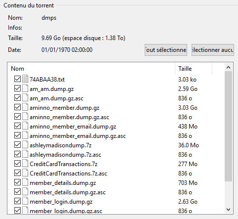 L'archive contient plusieurs sous-archives. Leur nom laisse entendre qu'elles contiennent les noms des membres (aminno_member.dump.gz), leur adresse e-mail (aminno_member_email.dump.gz), l'historique des transactions par carte bancaire (CreditCardTransactions.7z), ou encore les données personnelles des membres (member_details.dump.gz). Les numéros des cartes bancaires ne sont pas stockés, et les mots de passe ne sont visibles que sous une forme chiffrée avec bcrypt.