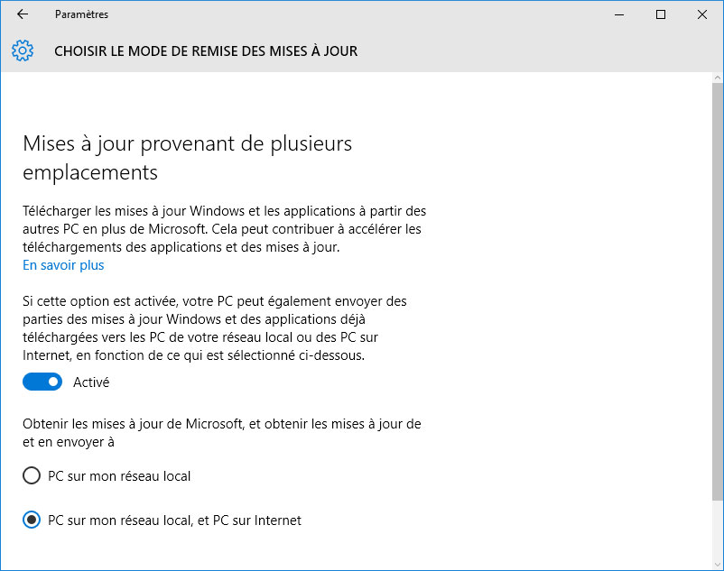 Mais Microsoft a la main lourde sur les mises à jour, et ne se soucie guère de gérer sa bande passante puisque les fichiers sont distribués en Peer-to-Peer (P2P), ce qui déporte une grande partie du trafic vers les internautes qui s'envoient les données les uns aux autres sans même s'en apercevoir. Par défaut, une option est activée dans Windows 10 qui autorise l'ordinateur à "envoyer des parties des mises à jour Windows et des applications déjà téléchargées vers (…) des PC sur Internet" :