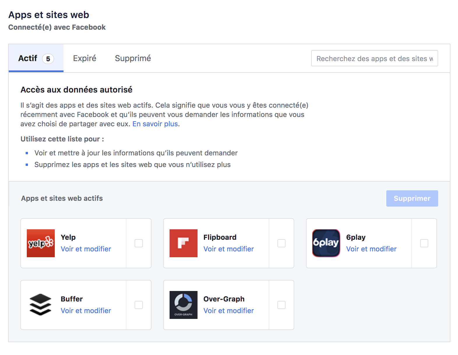 Une fois dans l’interface, on s’aperçoit qu’elle est un poil moins austère qu’avant et qu’elle présente les applications que vous avez utilisées en trois catégories. La plus importante est bien sûr celle notée « Actif », qui vous montre les applications qui utilisent encore vos données personnelles. Quelles données ? Cliquer sur « Voir et modifier » vous permettra de faire une revue complète de leur inventaire.