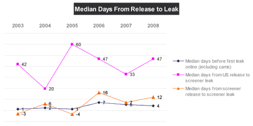 Les autres sources de piratage, elles, restent globalement au même niveau qu’avant. Ainsi en 2008 un screener (qualité DVD) apparaît en moyenne 47 jours après la sortie du film sur les écrans américains, contre 42 jours en 2003. Le chiffre était tombé à 33 jours l’an dernier. Toutes sources de piratage confondues, il se passe uniquement 4 jours en moyenne entre la sortie du film aux USA et son apparition sur les réseaux P2P.